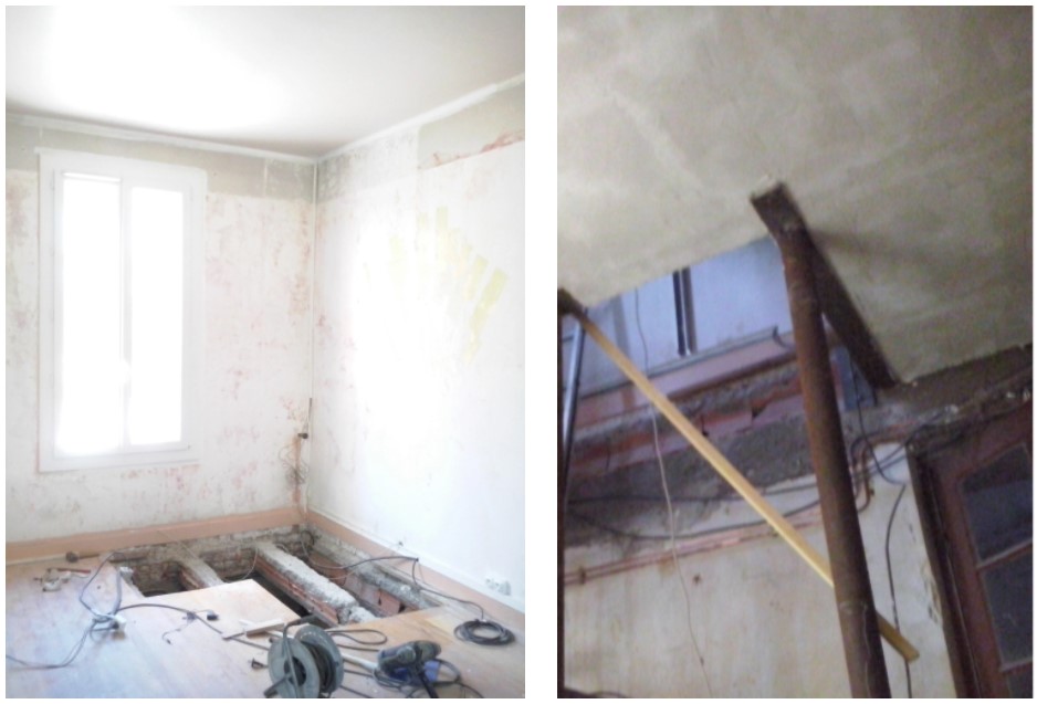 Nous avons donc opté pour une trémie en L, soutenue au niveau inférieur par des poteaux de récupération. Le radiateur a dû être déplacé en vue d’être installé plus tard à gauche de la fenêtre.