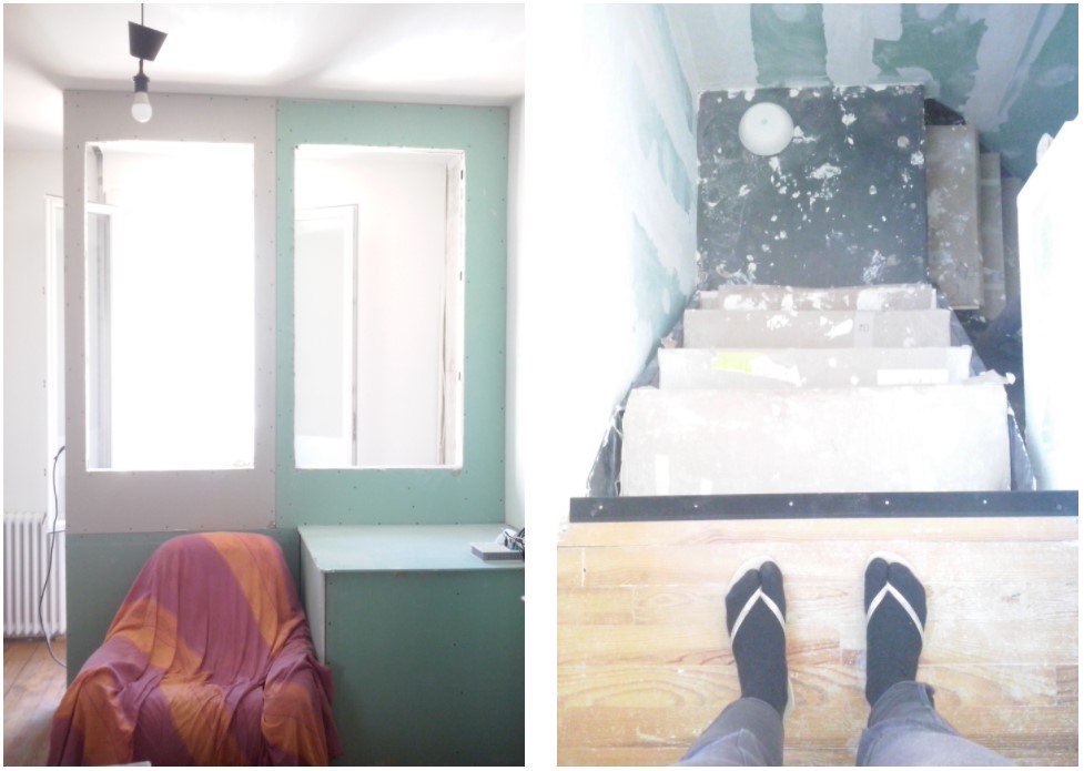 Après une phase de placo fait maison en mode Tétris (faut pas gâcher), la cage d’escalier est dégueulasse fonctionnelle. Et bim!