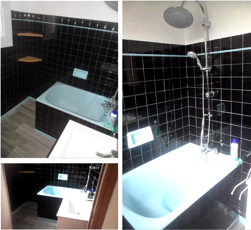 Dans la catégorie pas assez pourri pour être rénové tout de suite, voici la salle de bain et ses presque 3m2 de pur bonheur kitch ( carreaux noirs, baignoire-sabot bleu layette, avec plinthes et listel assortis s’il vous plaît). Propre et en bon état, elle n’est pas assez problématique pour être traitée en priorité. Mais je m’estime heureuse car j’ai déjà vu ailleurs des combos lavabo-vert-épinard + carrelage-beige moins engageants.