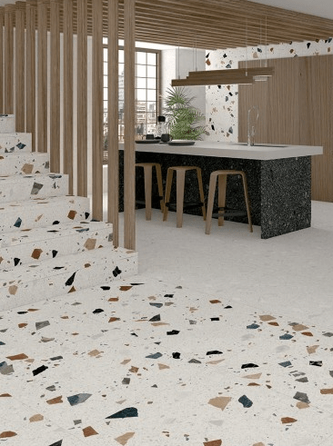Le carrelage terrazzo renait de ses cendres (Arts Carrelages). Le carrelage marron en chevrons, non.