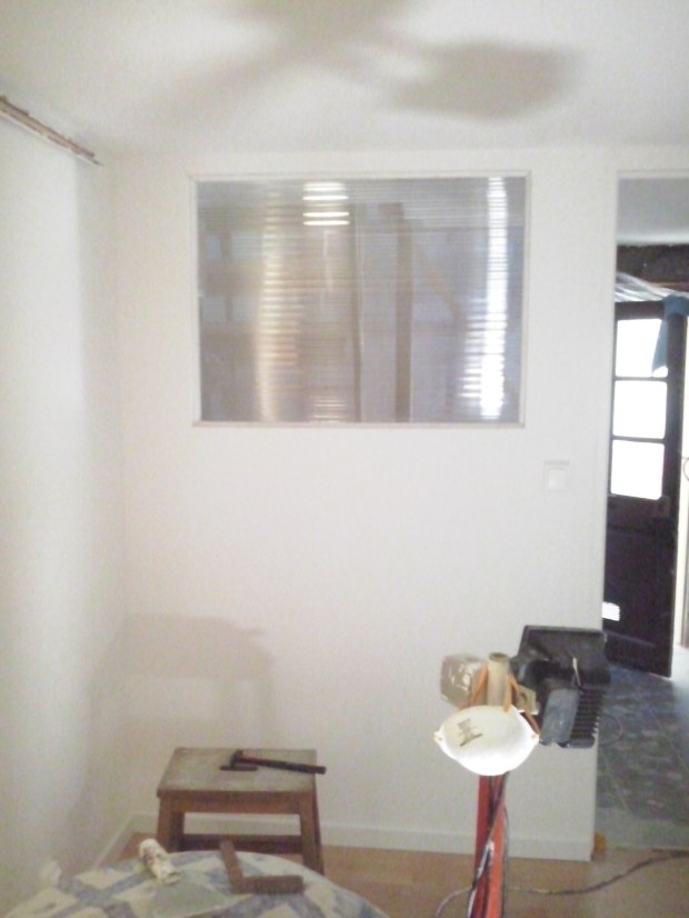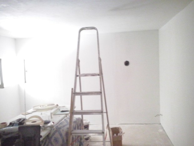 Pour le plafond en hourdi, nous avions d’abord songé à du placo ou à du lambris, mais cela aurait considérablement réduit la hauteur de la pièce, déjà assez basse vu qu’elle ne dépasse pas les 2,15 mètres. Nous avons donc opté pour un enduit de lissage posé patiemment par nos soins, et le résultat est plutôt sympa. Après la toujours très fastidieuse et exaspérante étape des joints de placo à enduire puis à poncer, nous avons pu peindre les murs et le plafond.