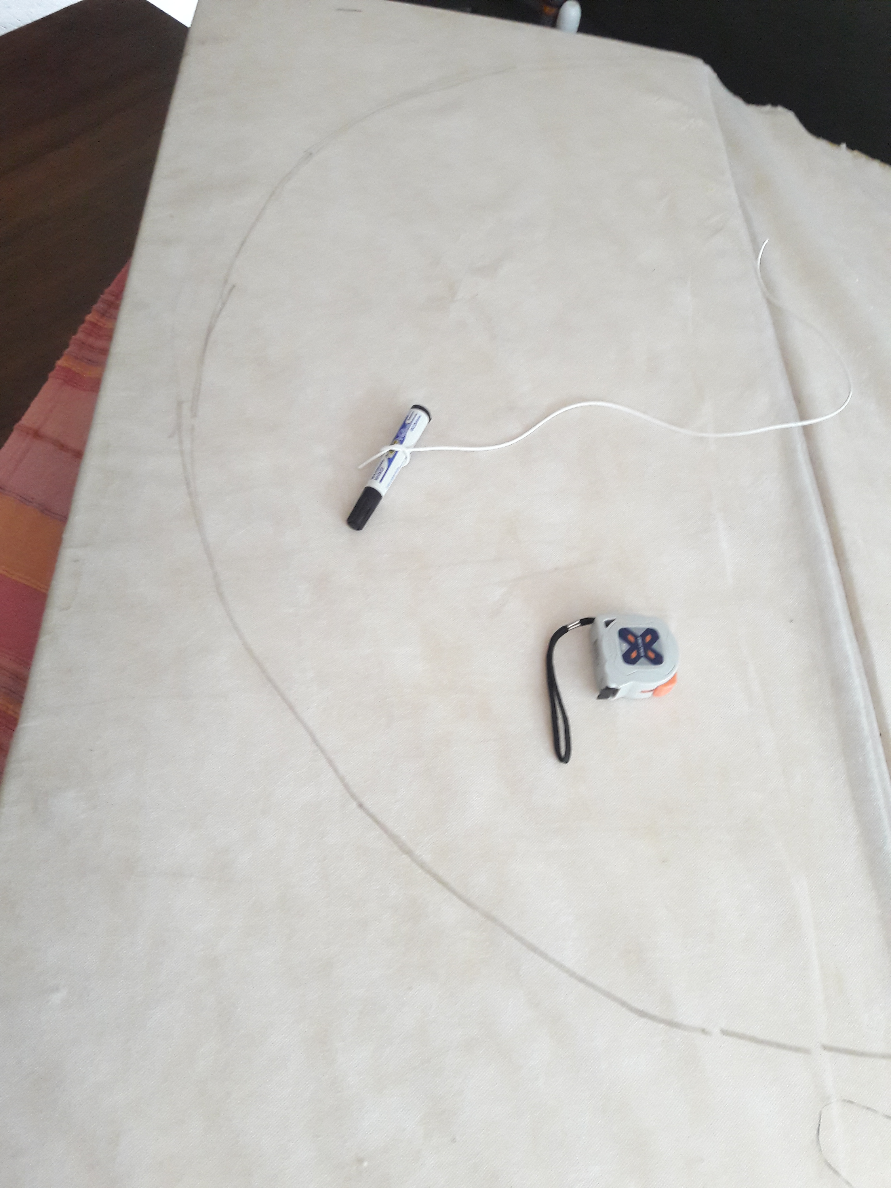 – tracez un disque de diamètre D2 en utilisant en guise de compas un feutre noué à une ficelle de la longueur du rayon (méthode que j’ai réutilisée plus tard pour découper une arche dans un panneau de bois).