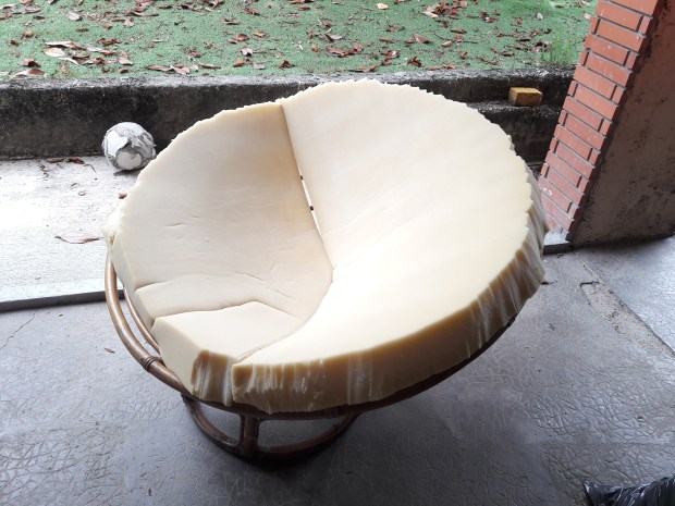 Si vous avez eu la chance de dénicher un de ces fauteuils vintage mais qu’il n’a plus son coussin d’origine, vous avez dû vous apercevoir qu’internet regorgeait de sites qui vendent des coussins ronds tous plus beaux les uns que les autres et spécialement adaptés aux structures Papasan. Cependant, si comme moi vous avez acquis votre loveuse pour une somme vraiment dérisoire, il peut sembler illogique de dépenser une ou plusieurs centaines d’euros pour le coussin. C’est pourquoi j’ai décidé de faire mon coussin moi-même avec ce que j’avais sous la main : un vieux matelas de clic clac en mousse. Alors si vous aussi vous avez ça en stock, je vous explique de ce pas comment le transformer en coussin pour votre Papasan.
