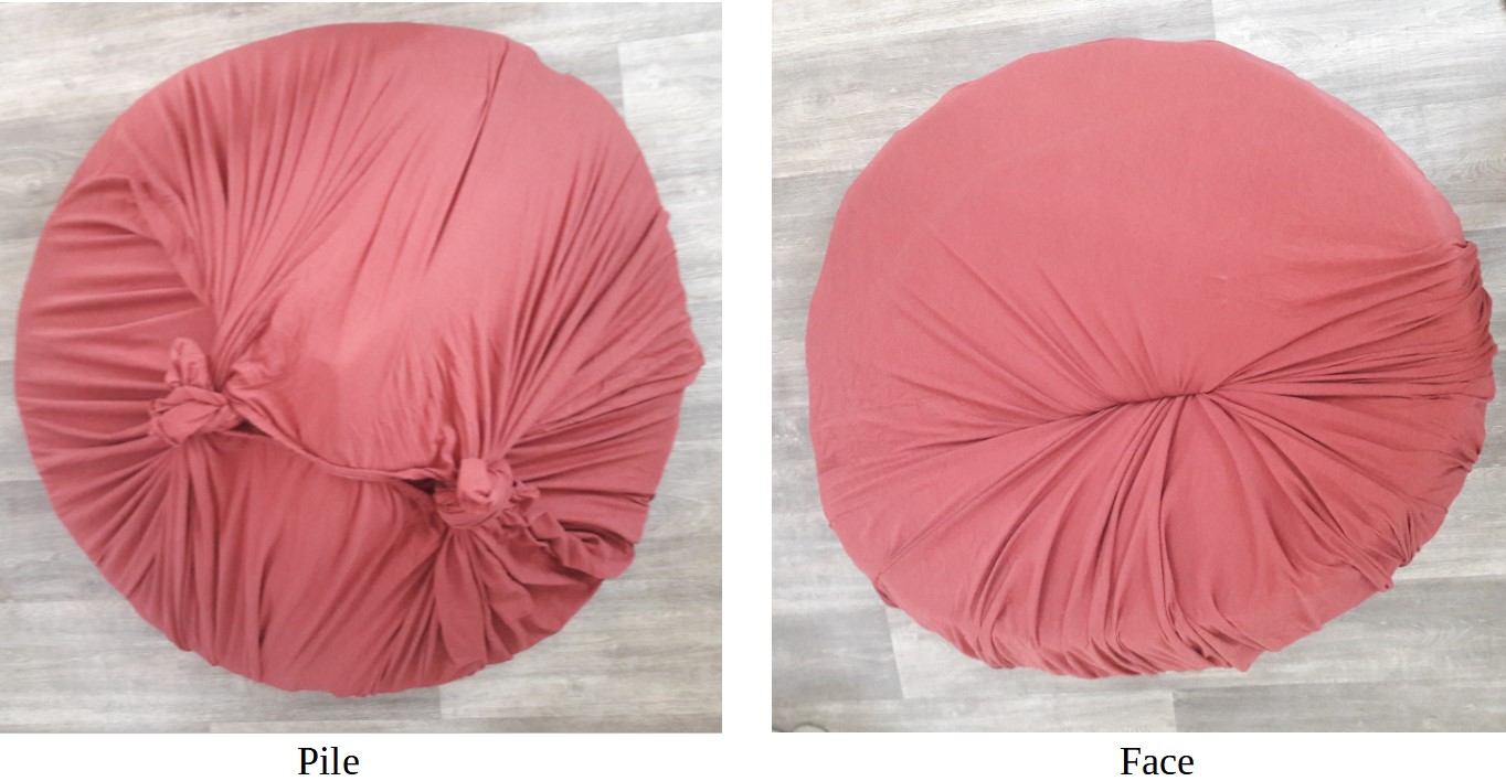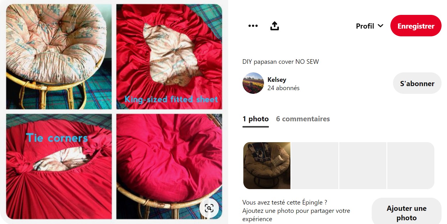 Je souhaitais que le coussin soit déhoussable à volonté afin de pouvoir laver le tissu. J’avais d’abord pensé recycler d’anciens rideaux pour créer une housse adaptée à mon coussin conique. Mais au cours de mes recherches, je suis tombée sur une publication Pinterest qui montre comment recouvrir un coussin Papasan avec un drap en jersey simplement noué à l’arrière.