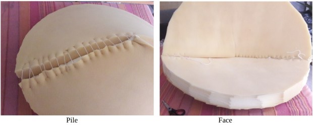 – cousez grossièrement les bords ensemble avec une grosse aiguille et de la laine ou de la ficelle. Attention, contrairement à ce que j’ai fait sur les photos, il faut veiller à ne pas coudre le centre (on doit pouvoir y passer la main). J’ai par la suite décousu un peu le coussin pour libérer la partie centrale, vous comprendrez pourquoi à l’étape 5.