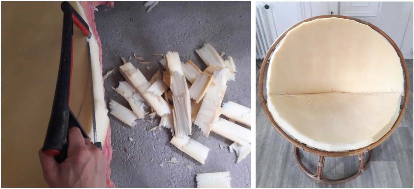– maintenant que le coussin est formé, reprenez les bords à la scie pour l’ajuster parfaitement à l’assise. Pour ma part, j’ai choisi de faire en sorte que le coussin laisse voir l’osier autour de l’assise.