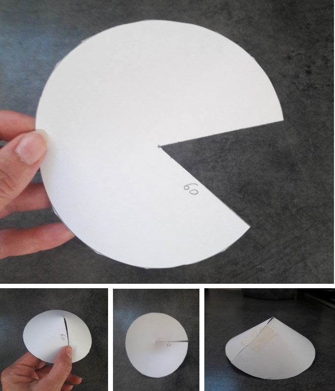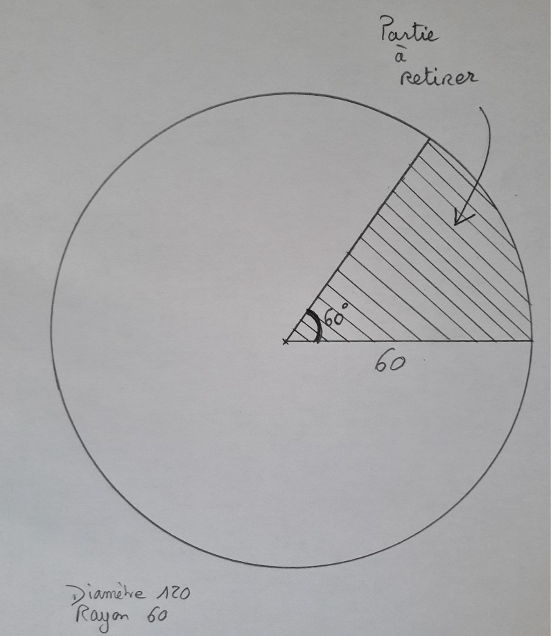 Pour obtenir par la suite un cône qui épouse au mieux le Papasan, il faut maintenant retirer une part du disque. Pour connaître l’angle de cette part, je vous donne une version « clefs en main » du calcul à effectuer :