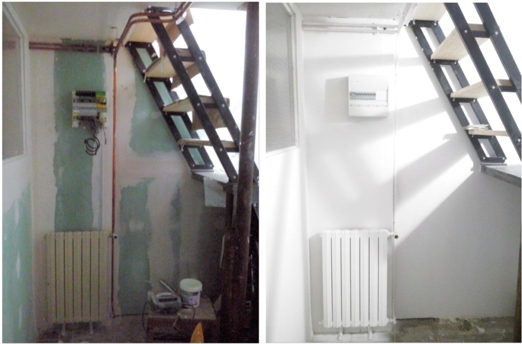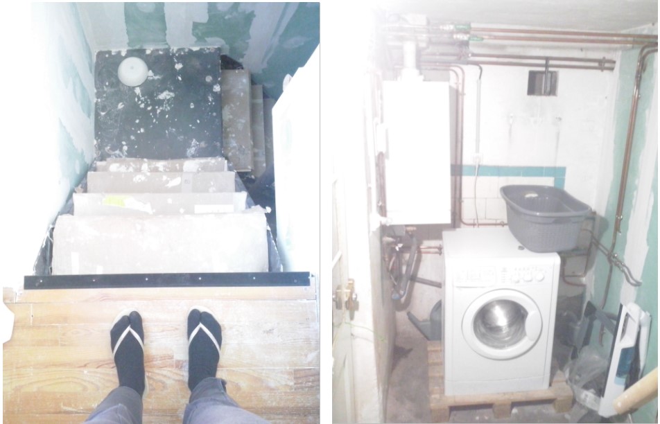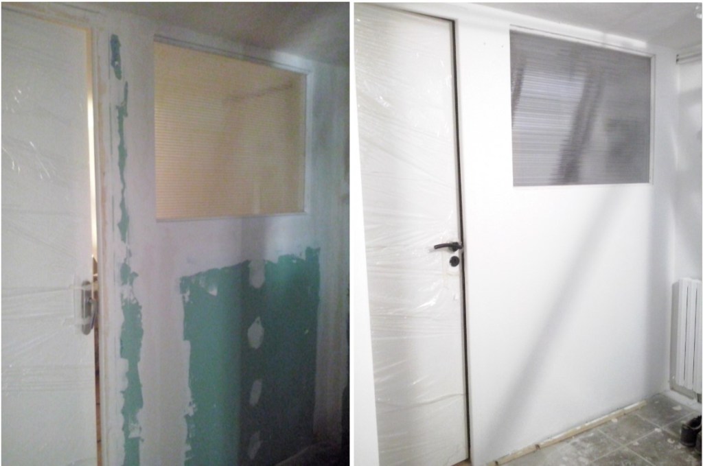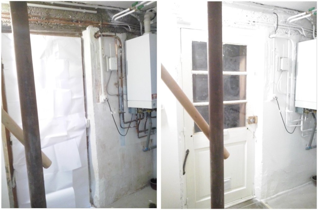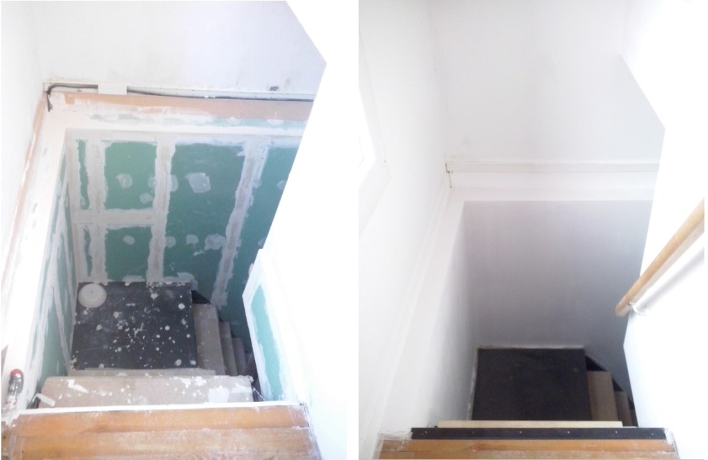 Alors une fois la chambre de notre fils au sous-sol toute belle, toute blanche et toute neuve, par un fabuleux effet de contraste, le palier-buanderie qui la dessert et la cage d’escalier, restés en l’état, avaient des allures de musée des horreurs, en mode deux-salles-deux-ambiances. C’est à dire qu’en gros, pendant près de 4 mois, c’était ambiance Halloween à chaque fois que je descendais faire une lessive :