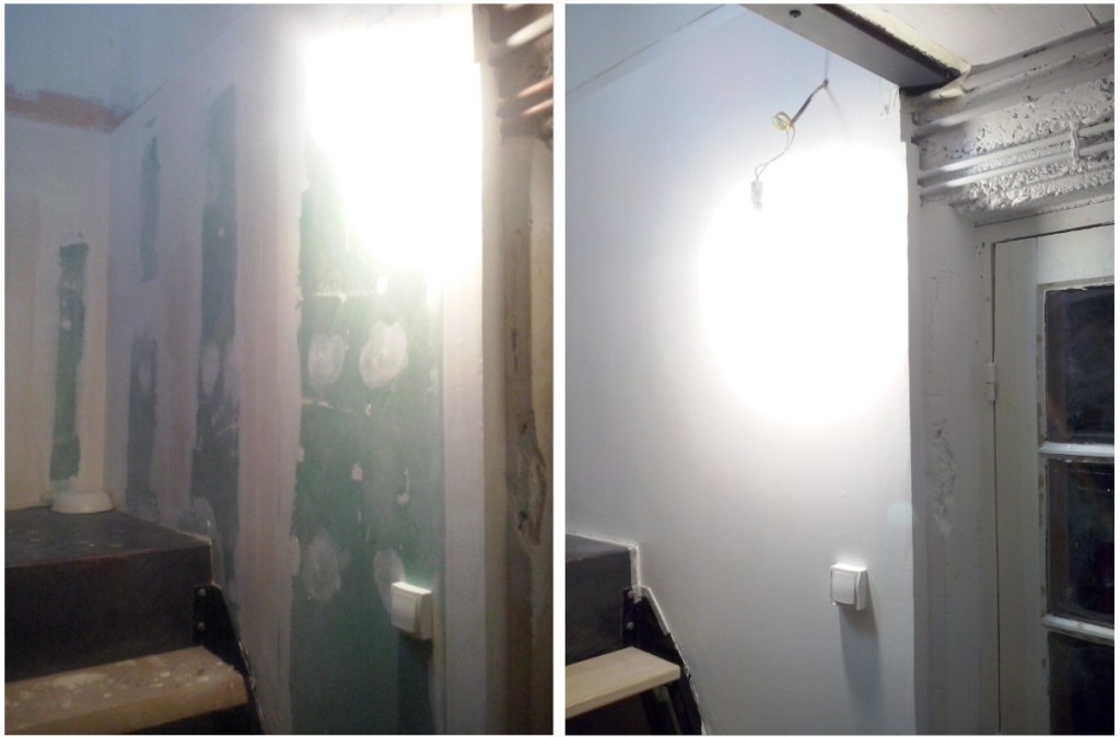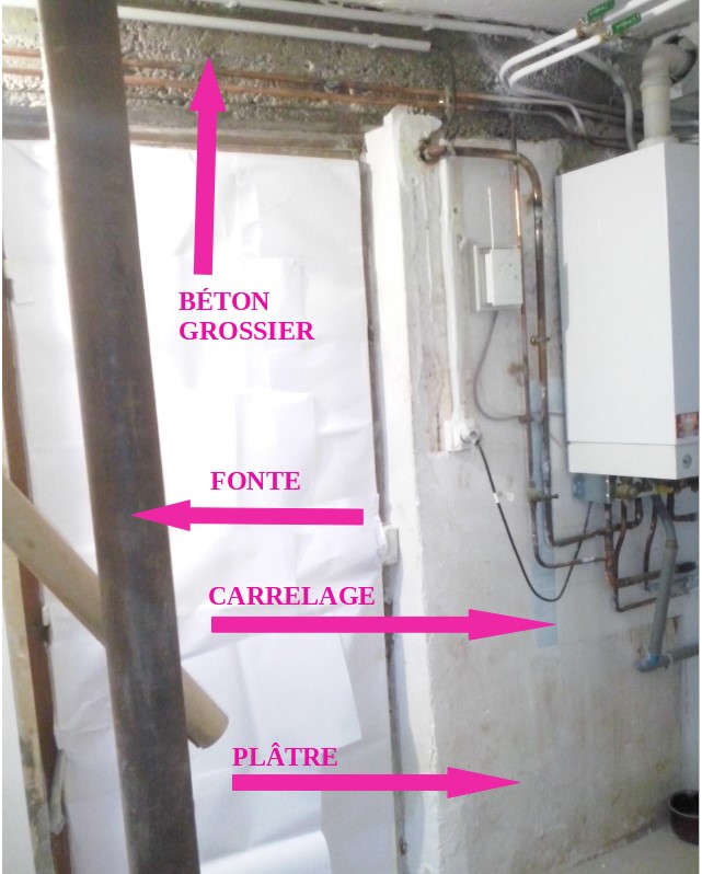 Les nouvelles cloisons sont en placo brut et ne posent pas de problème particulier. Par contre, les murs d’origine sont mi-carrelage, mi-plâtre, avec aussi un linteau en béton grossier au dessus de la porte qui donne sur le jardin. Pour couronner le tout, les trois colonnes porteuses qui soutiennent la trémie de l’escalier sont en fonte (et de couleur indéfinie, ni tout à fait grise, ni tout à fait marron).