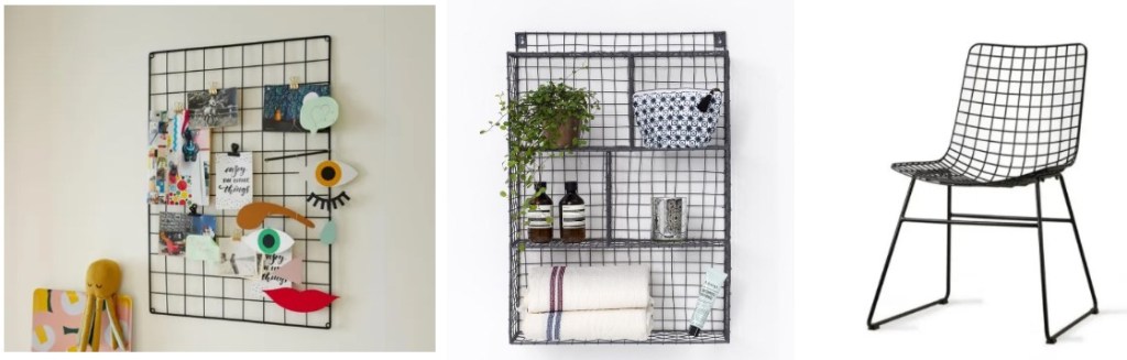 Si vous voulez passer à la vitesse supérieure, pourquoi ne pas opter pour du petit mobilier grillagé en métal ? De la simple grille murale à la chaise en passant par l’étagère, ils apportent du relief au motif quadrillé et un petit côté industriel.