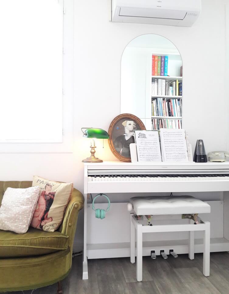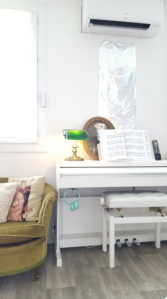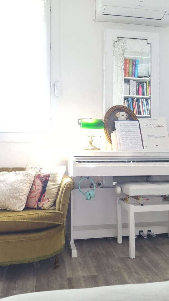 Concernant le miroir du piano, l’alu avait prédit qu’on verrait se refléter les bibliothèques depuis le salon. (Et aussi que ma fille pourrait voir la télé en fouine à travers le miroir depuis le pas de la porte de sa chambre).