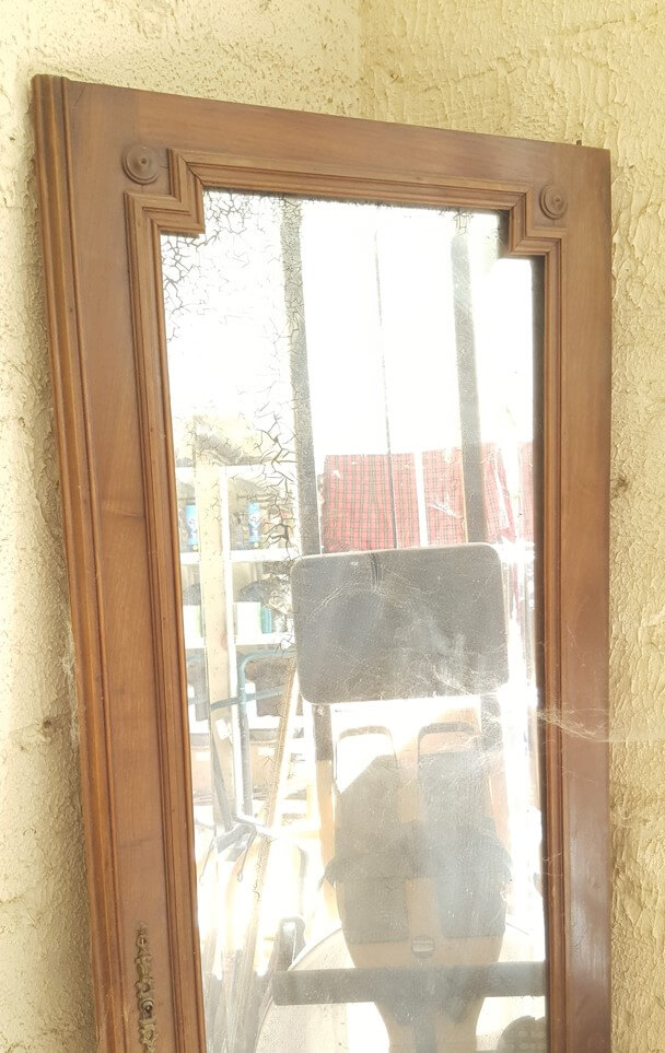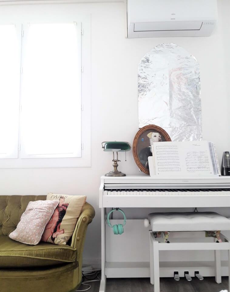 Je l’aimais beaucoup, ce miroir arche, mais un jour de canicule, cette enflure s’est décollée pour s’écraser au sol. J’ai donc invoqué une nouvelle fois le papier alu pour savoir si la porte d’armoire Art Déco en attente dans le garage serait jolie au-dessus du piano :