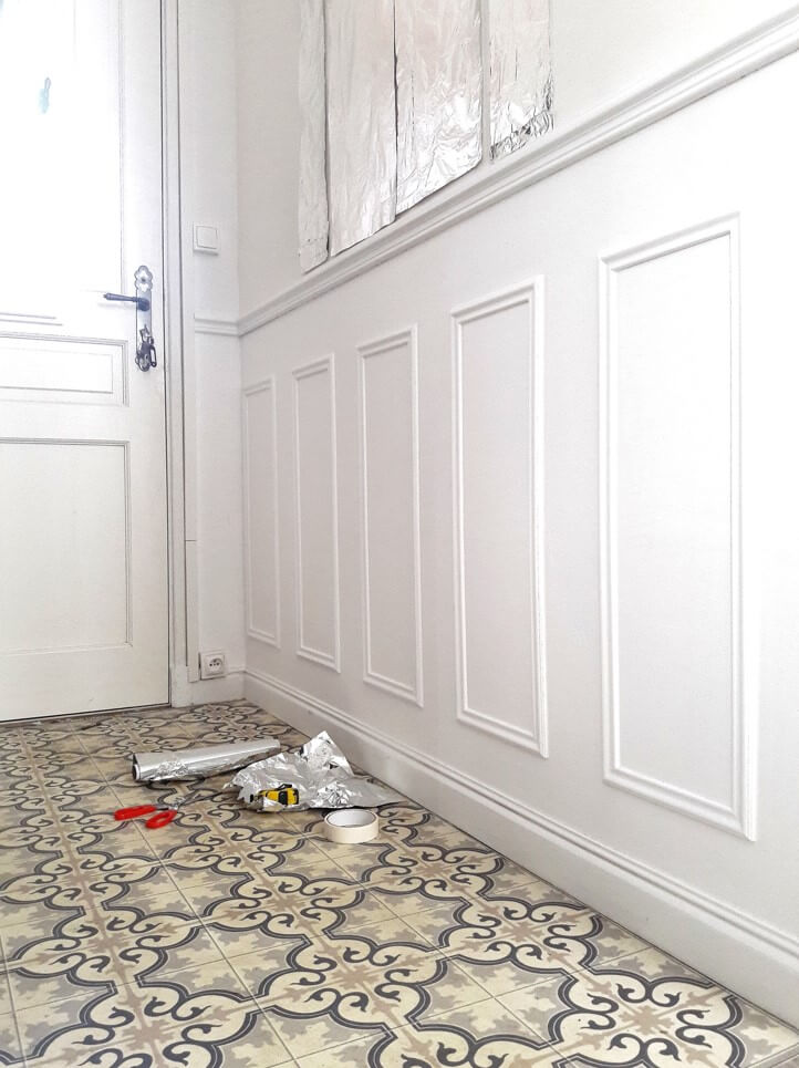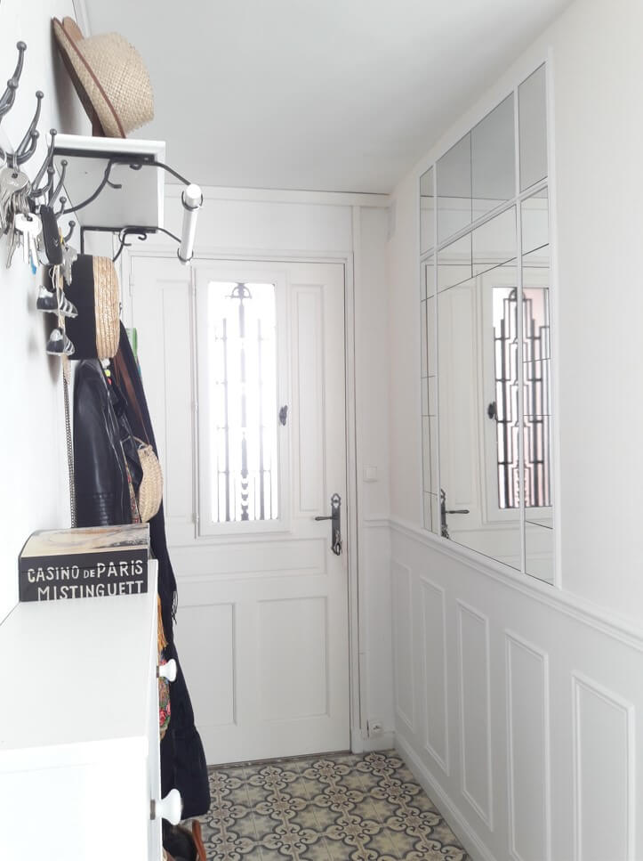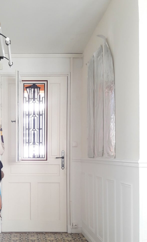 Pour le vestibule, j’étais assez inquiète que le futur miroir ne reflète trop les manteaux, mais l’oracle le papier alu m’a confirmé que si dans la version occupant toute la partie haute du mur, le miroir aurait effectivement reflété la porte d’entrée et les manteaux, la version partielle ne refléterait, elle, que la porte d’entrée. Et c’était vrai :