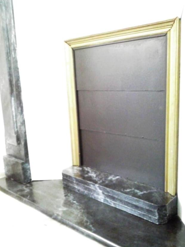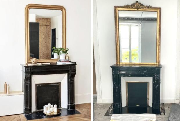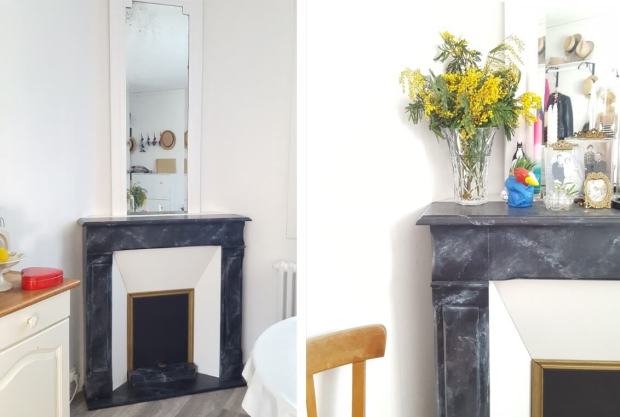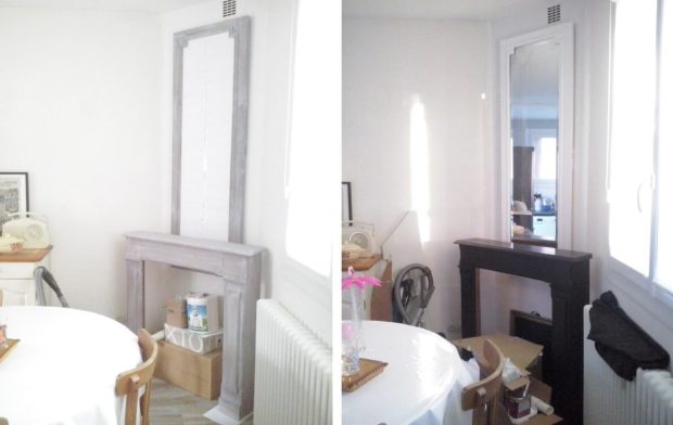 Jusqu’au jour où nous avons enfin eu du temps à consacrer à notre projet de fausse cheminée. Nous avons commencé par installer une porte d’armoire Art Déco en guise de miroir trumeau (sa sœur jumelle se trouve aujourd’hui au dessus du piano).