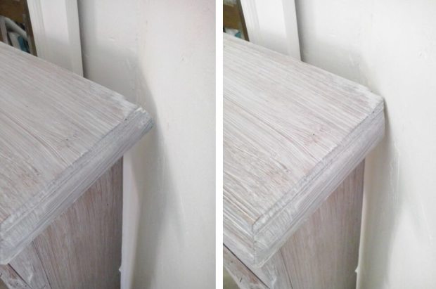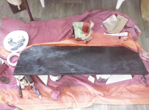 Une fois obtenue l’illusion du marbre, j’ai appliqué un nombre incalculable de couches de vernis protecteur brillant tellement je suis maniaque.