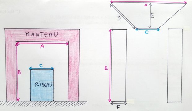 Pour déterminer la position idéale du rideau et donc connaître les valeurs D, E et F, j’ai réalisé un gabarit en carton que j’ai ajusté jusqu’à obtenir un ensemble satisfaisant.