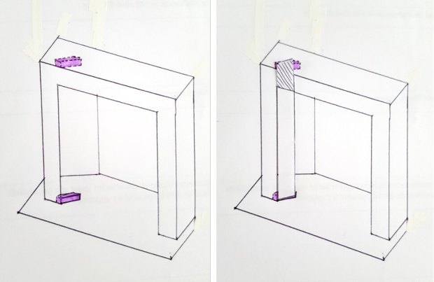 Pour finir, j’ai positionné le trapèze. Celui-ci doit venir reposer sur la rainure du cadre et être maintenu en haut par le manteau de cheminée et sur les côtés par les deux rectangles. Autrement dit, il tient grâce à l’emboîtement, la gravité terrestre et l’opération du Saint-Esprit. Sa stabilité dépend donc de la bonne fixation des autres éléments.