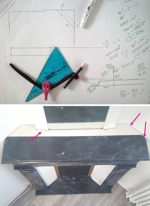 REMARQUE: Pour un résultat parfait, il était important que la fausse cheminée épouse le mur en pan coupé. Ceci a nécessité un certain nombre de calculs et de découpes dont je vous épargnerai ici la description. Tout ce que je peux vous dire, c’est que j’ai dû réinvestir le Théorème de Thalès.