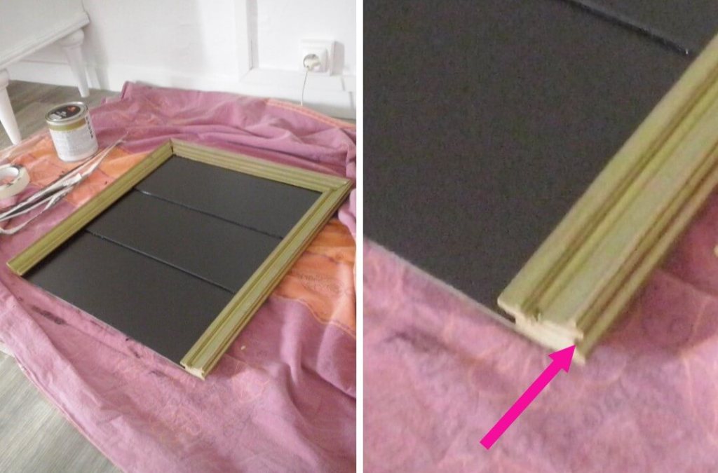Pour cette étape, j’ai utilisé un cadre de tableau doré d’environ 43 cm par 51 cm, dont j’ai coupé la partie basse. À noter : il est important pour l’étape 3 que la moulure du cadre comporte une rainure en haut et sur les côtés.