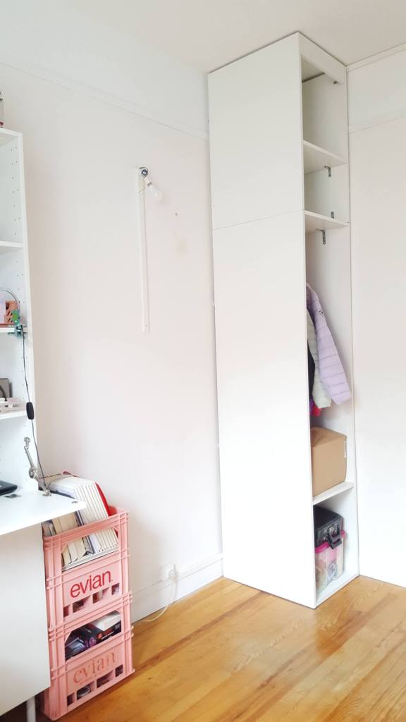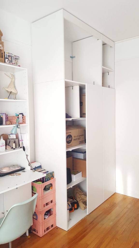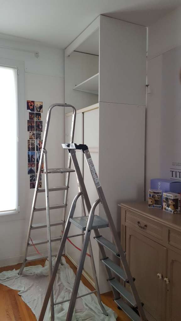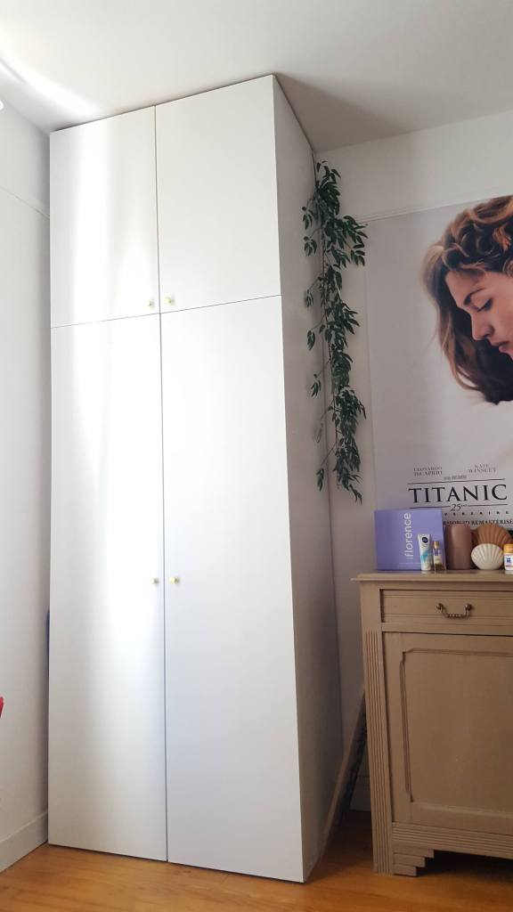 Nous avons commencé par le placard de gauche, en conservant la structure d’une vieille armoire et en y ajoutant un surmeuble en panneaux mélaminés.