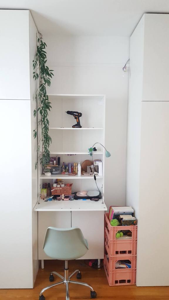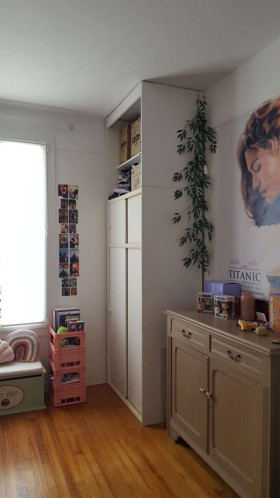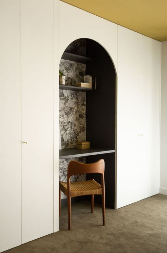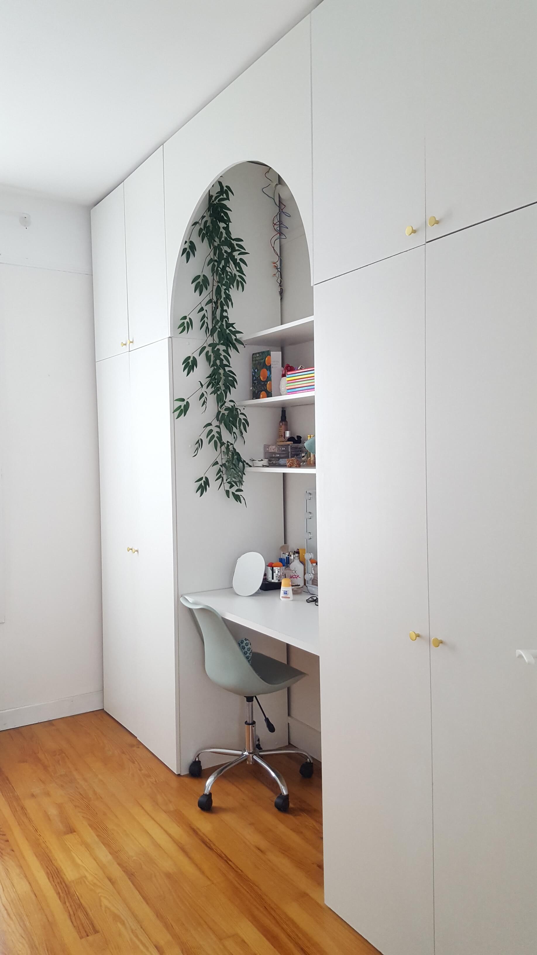 La chambre de notre fille manquant cruellement de rangements et d’un bureau digne de ce nom, j’ai tout de suite flashé sur ce projet. J’aime tout : la discrétion des placards, le volume de rangement jusqu’au plafond, la niche, le bureau suspendu et surtout l’arche, qui apporte du cachet à l’ensemble.